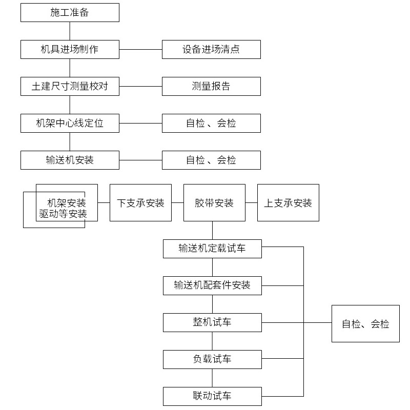 施工班組在完成每個分項工程時,施工員要求和監督施工人員進行質量自檢和消缺。在自檢完成后,施工員及時進行質量抽檢工作,并馬上將抽檢結果通知施工班組,對不符合質量的部分帶式輸送機責令有關班組限期消缺。