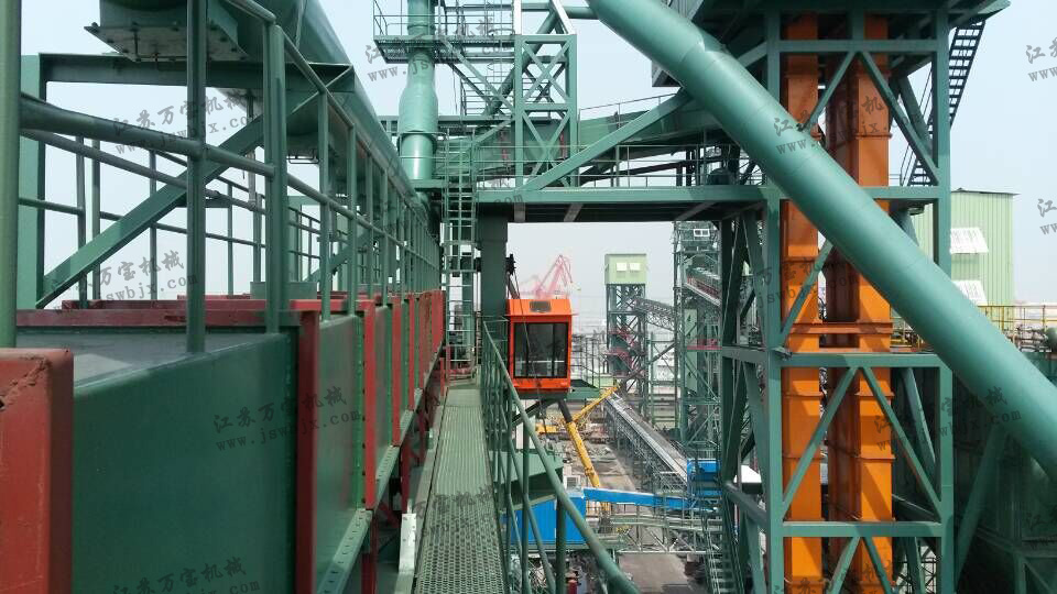 裝船機系統(tǒng):本機由門架轉臺、擺動梁、前支撐系統(tǒng)、后支撐系統(tǒng)、伸縮溜筒系統(tǒng)、空氣輸送斜槽系統(tǒng)、除塵風管系統(tǒng)、司機室、防風系纜、緩沖器、電氣系統(tǒng)、平臺走道和梯子等部分組成。為使裝船作業(yè)安全、可靠,還裝設各種安全保護和指示裝置。